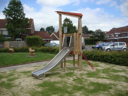 Deze robinia driehoektoren springt in het oog door het uitgekiende ontwerp van torens en platformen in een niet alledaagse driehoekige vorm. De toegang tot het platform gebeurt met behulp van elementen met verschillende moeilijkheidsgraad zoals een ladder en klimnet. Voor bewegingsspelen staat een glijbaan ter beschikking. De winkel met toonbank is geschikt voor imitatie- en rollenspelen.