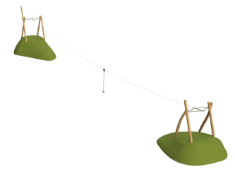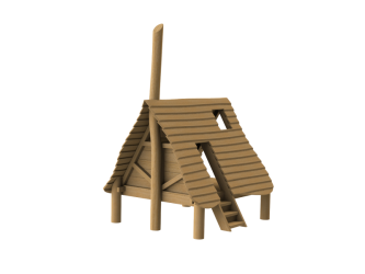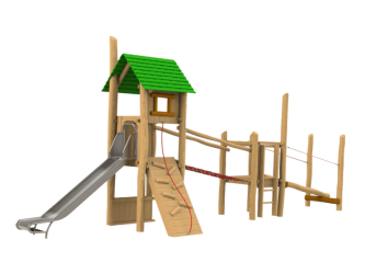 Deze robinia driehoektoren springt in het oog door het uitgekiende ontwerp van torens en platformen in een niet alledaagse driehoekige vorm. De toegang tot het platform gebeurt met behulp van elementen met verschillende moeilijkheidsgraad zoals een schuine wand en klimnet. Voor bewegingsspelen staat een glijstang ter beschikking. De winkel met toonbank is geschikt voor imitatie- en rollenspelen.