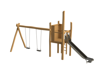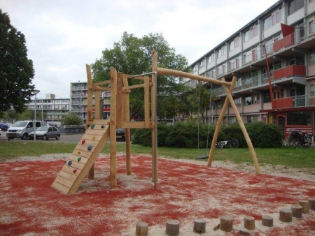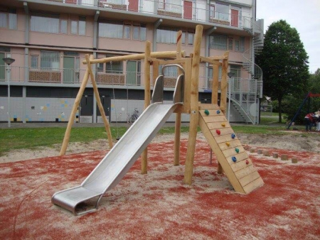 Deze combinatie is op zich een kleine, maar volledige speelplaats. Het ruime spelaanbod spreekt kinderen aan. De combinatie van glijbaan, glijstang en schuine wand maakt dat het toestel op diverse manieren beklommen en weer verlaten kan worden. De speelcombinatie met schommel is op zich al bijna een kleine complete speelplaats. De schommel is een attractief bewegingstoestel.