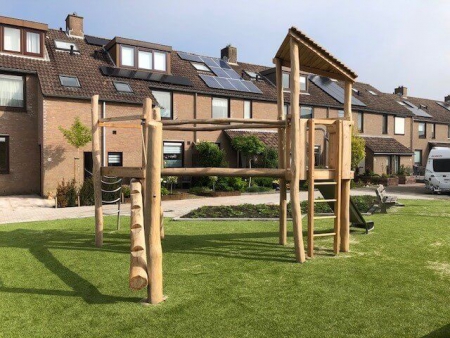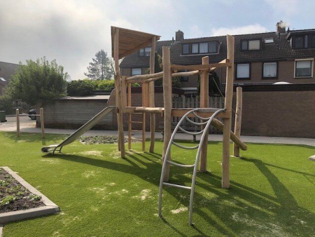 Deze veelzijdige torencombinaties nemen slechts een kleine ruimte in, maar ze bieden een scala aan bewegingsactiviteiten. De esthetische driehoektoren harmonieert uitstekend met de diverse aanbouwtoestellen. Hij kan tegelijkertijd een toevlucht, een vesting of een klauterobject zijn; de kleine ruimten bieden geborgenheid en bescherming. Via verschillende toegangen kan men het uitkijkplatform bereiken. Langs de glijbaan komt men op een prettige manier weer op de begane grond. De aanbouw- en verbindingstoestellen hebben een verschillende moeilijkheidsgraad en ze sporen aan tot gevarieerde spelen.